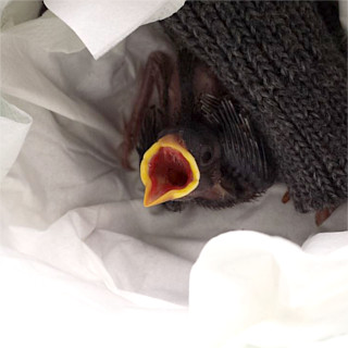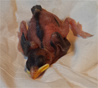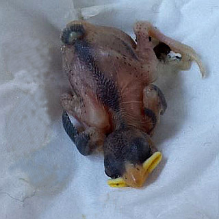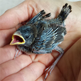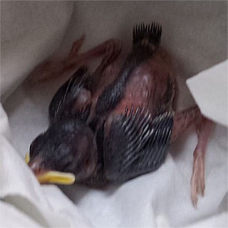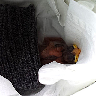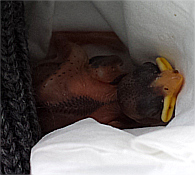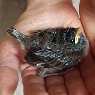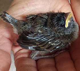 Einmal im Jahr laden Gartenbesitzer am Tag der offenen Gartentür dazu ein, ihre privaten Gartenparadiese zu besichtigen. Deshalb fuhren wir am Sonntag, den 25.06.17 nach Umpfenbach zur Familie Drecker, wo ein früherer Arbeitskollege meiner Frau seine Gartentüre öffnete. Nach der Besichtigung des wunderschönen Gartens wollten wir gerade wieder gehen, als andere Besucher riefen: "Da ist gerade ein Jungvogel aus dem Nest gefallen!". Der erste Anblick des kleinen Piepmatzes war wenig ermutigend. Ein nacktes und noch blindes Vogelküken war aus etwa fünf Metern Höhe vom Nest unterm Dach auf eine Holzdiele geknallt und zuckte nur noch wenig vor sich hin. Ich nahm es in die Hand und konnte erstaunt feststellen, dass es wie durch ein Wunder zumindest äußerlich nicht verletzt war und noch um sein Leben kämpfte. Auch wenn es nahezu aussichtslos erschien entschlossen wir uns einen Versuch zu unternehmen um das kleine Kerlchen aufzupäppeln und nahmen es mit nach Hause.