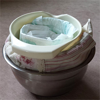 Da das Küken noch fast völlig nackt ist braucht es unbedingt ein warmes Zuhause. Also waren wir kreativ und bauten ihm ein etwas ungewöhnliches Nest. Von außen nach innen verwendeten wir eine Edelstahlschüssel, die die Wärme speichert, die ein mehrmals täglich und anfangs auch nachts in der Mikrowelle aufgewärmtes Kirschkernkissen liefert. Eine Plastikschüssel leitet die Wärme in Maßen an eine kleine zu einem Nest geformte Babywindel weiter. In die Windel haben wir einen Wollstumpf gelegt und darüber Kosmetik- und Taschentücher, die aus hygienischen Gründen regelmäßig ausgetauscht werden. Zu guter Letzt legten wir noch ein kleines quadratisches Stück eines alten Wollstrumpfes ins Nest, unter das sich unser Küken kuscheln kann wenn ihm doch mal kalt werden sollte.