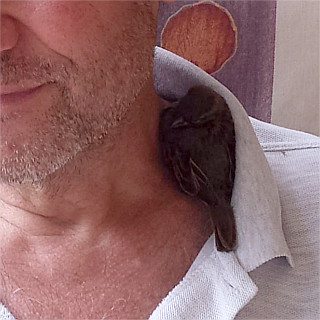 Furchi büchst aus! Damit sich Furchi langsam an seine neue Umgebung im Freien gewöhnen kann stellen wir ihn immer häufiger in einem Käfig auf die Terrasse. Durch sehr zutrauliche Blaumeisen, junge Rotschwänzchen und rufende Spatzen animiert zeigte er uns an, dass er gerne mal den Käfig verlassen würde. Da er drinnen im Haus bisher nie weiter als zwei Meter geflogen ist taten wir ihm den Gefallen und öffneten den Käfig. Und was macht unser kleiner Kerl: Er setzt an und fliegt nicht etwa, wie sonst üblich, auf meine Hand oder meine Schulter, sondern auf direktem Weg sieben, acht Meter weit auf unsere große Eiche. Oh Schreck! Wenn er sich jetzt verfliegt bekommt Furchi ein großes Problem, weil er noch nicht selbständig fressen kann. Gott sei Dank konnte ich ihn mit einer Leiter gerade noch so erreichen und wieder nach unten holen. Schreck lass nach! Dieses kleine Experiment werden wir so schnell nicht mehr wiederholen! Später war wohl auch Furchi froh, dass er wieder seinen Lieblingsort aufsuchen konnte und sich in meinen Nacken kuscheln durfte.