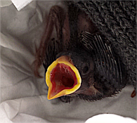 Unserem Zögling geht es erstaunlich gut. Er entwickelt einen großen Appetit und sperrt inzwischen häufig. Ein wenig Hoffnung macht sich breit!