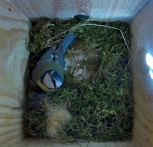 Bei sonnigem Wetter hat Mama Blaumeise die Nestbauaktivitäten wieder aufgenommen. Auch Blaumeisenpapa "Kleiner Held" ist zu Beginn des Videos im Kasten zu sehen. Doch seine Liebste gab ihm schnell zu verstehen, dass der Nestbau Weibchensache ist.