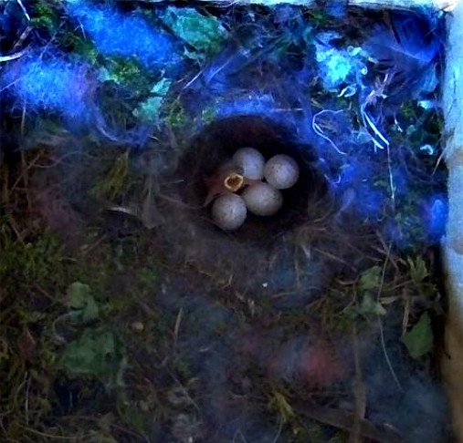 Mama Blaumeise scheint ohne Papa mit der Brut überfordert zu sein. Denn sie brütet leider nur zeitweise. Nachmittags und abends hält sie sich recht häufig im Kasten auf, doch morgens und vormittags sitzt sie viel zu selten auf ihrem Gelege. Mit hoher Wahrscheinlichkeit werden deshalb leider keine Küken schlüpfen.
