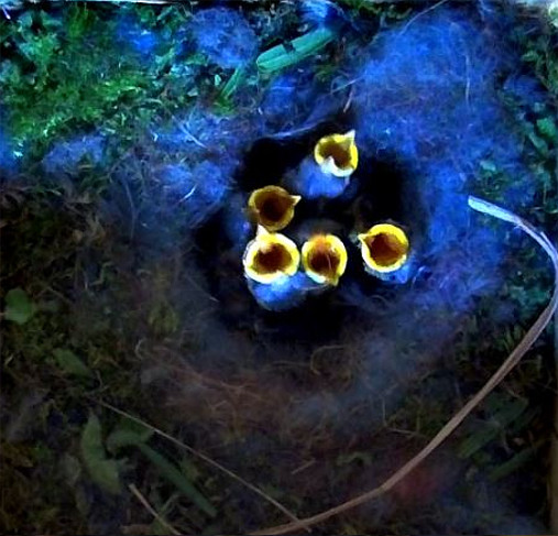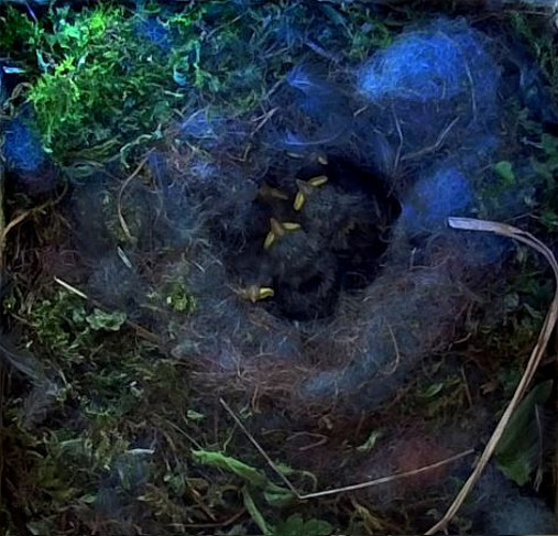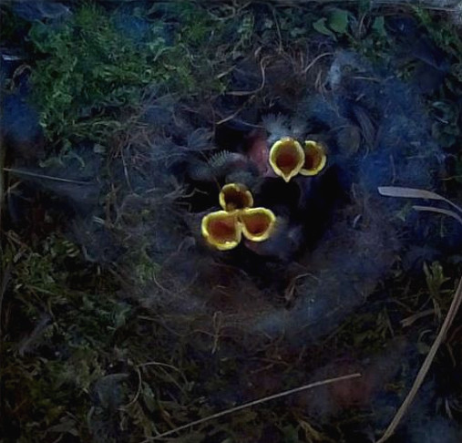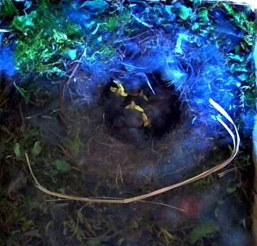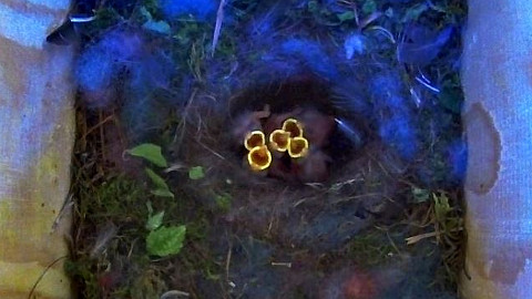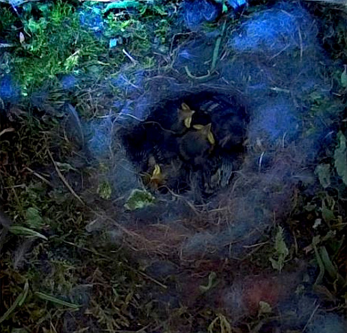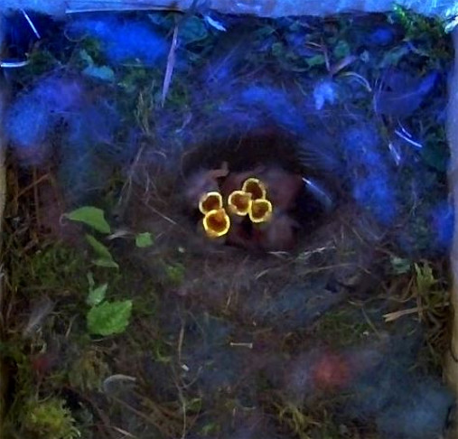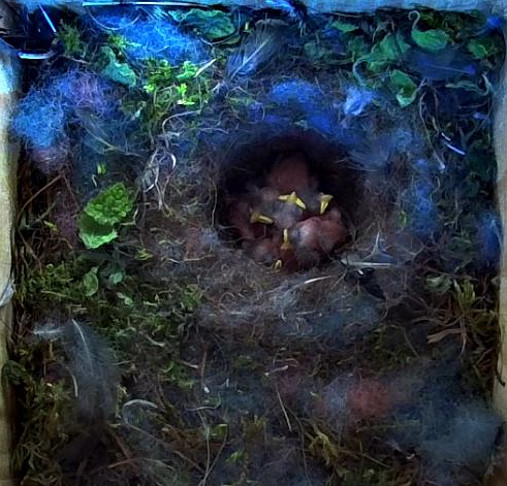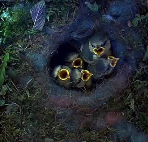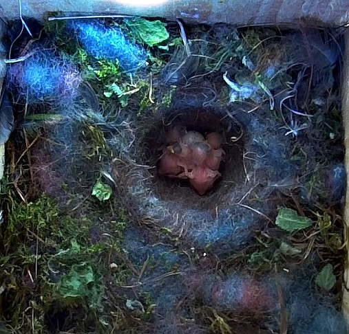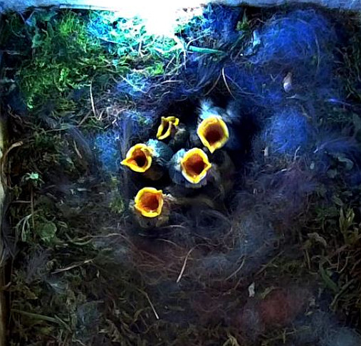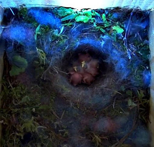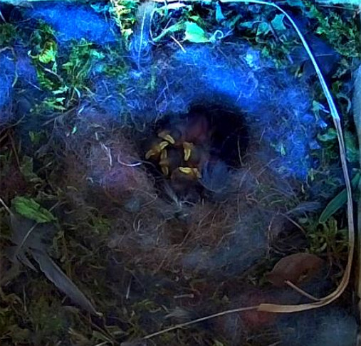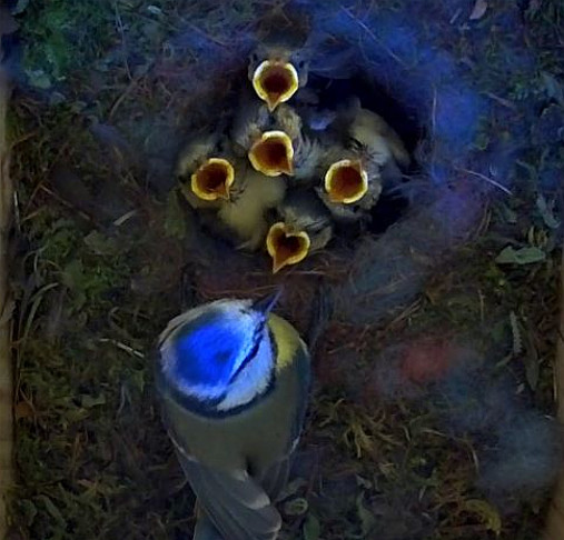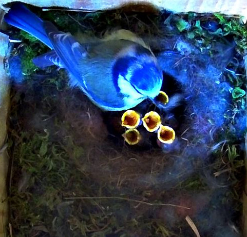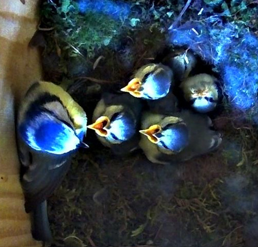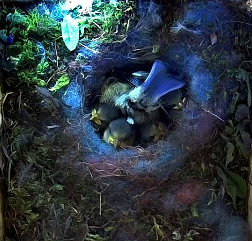 Die diesjährige Blaumeisenbrut macht mich fertig! Gestern hoffte ich noch, dass nach dem Umsiedeln der Hummel nun endlich etwas Ruhe einkehren würde. Doch dann lag heute Nachmittag plötzlich ein Küken außerhalb der Nestkuhle. Leider gibt es von diesem Vorfall kein Videomaterial. Möglicherweise hat ein Specht versucht das Küken aus dem Kasten zu ziehen. Allerdings gilt der Kasten als räubersicher und es gab auch keinerlei Kampfspuren. Nistkasten und Nest waren vollkommen unversehrt. Und auch das Küken schien zumindest äußerlich keine Verletzungen zu haben. Dank eines schnellen Hinweises konnte meine Frau das Küken rasch wieder in die Nestkuhle legen. Später schien es dem Küken wieder gut zu gehen, denn man konnte wieder fünf Schnäbel betteln sehen. Herzlichen Dank an Astrid! Vermutlich hat sie dem Küken das Leben gerettet!