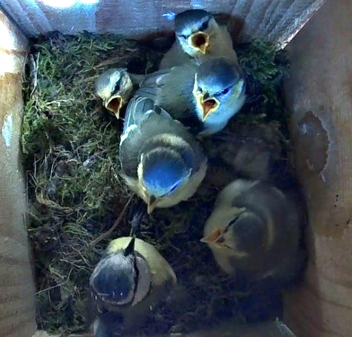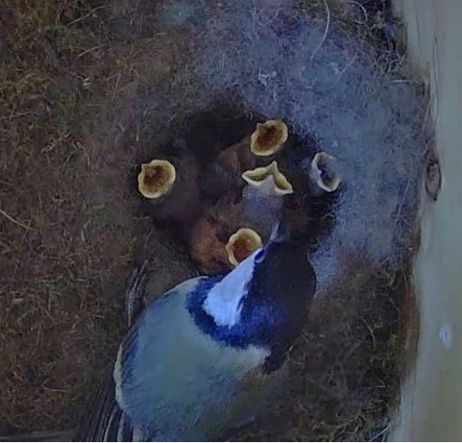 Bisher verläuft die Kohlmeisenbrut im Nistkasten-2 bilderbuchmäßig. Papa und Mama Kohlmeise versorgen ihre Küken vorbildlich. Alle 5 Nestlinge entwickeln sich prima. Heute sind sie bereits 17 Tage alt. Damit sind die restlichen Tage, die die Kleinen noch im Nistkasten verbringen werden, bereits gezählt. Normalerweise verlassen junge Kohlmeisen ihre Brutstätte nach 20 bis 21 Tagen. Unsere jungen Kohlis werden den Kasten wahrscheinlich sogar einen Tag früher verlassen. 😊